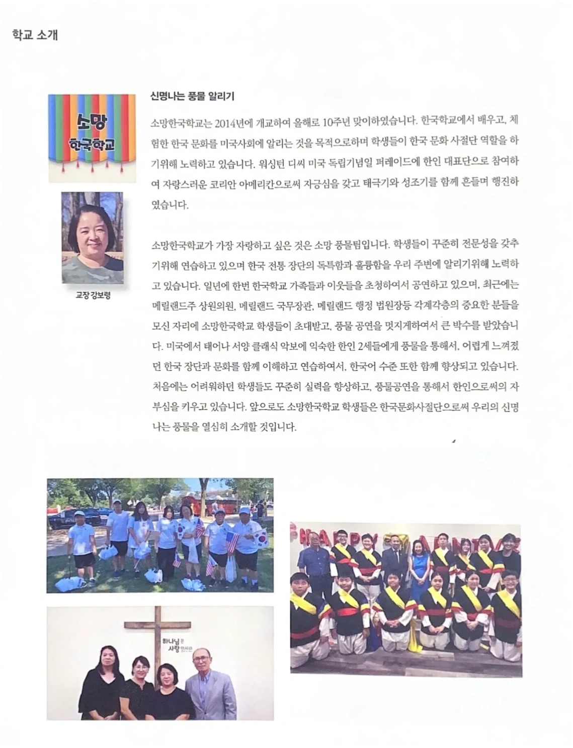 소망한국학교는 2014년에 개교하였으며 학생들이 하나님의 사랑 안에서 한국 역사와 문화체험을 통해 한국을 배우고, 한국어 실력 향상에 힘쓰며, 더욱 즐거운 한국학교가 될 수 있도록 최선을 다하고 있습니다.